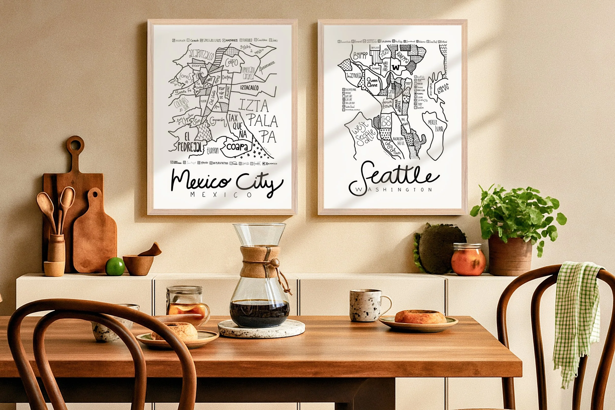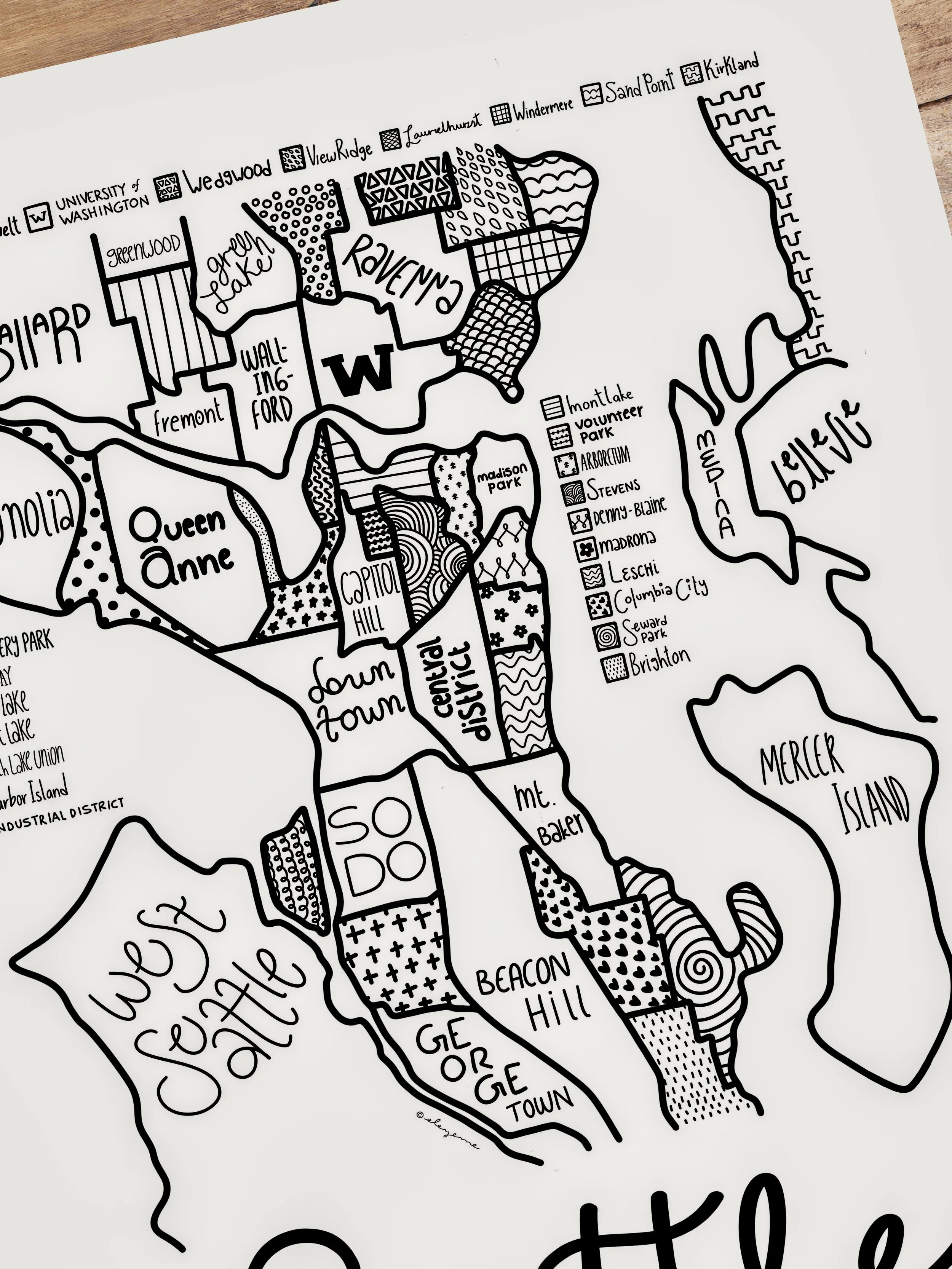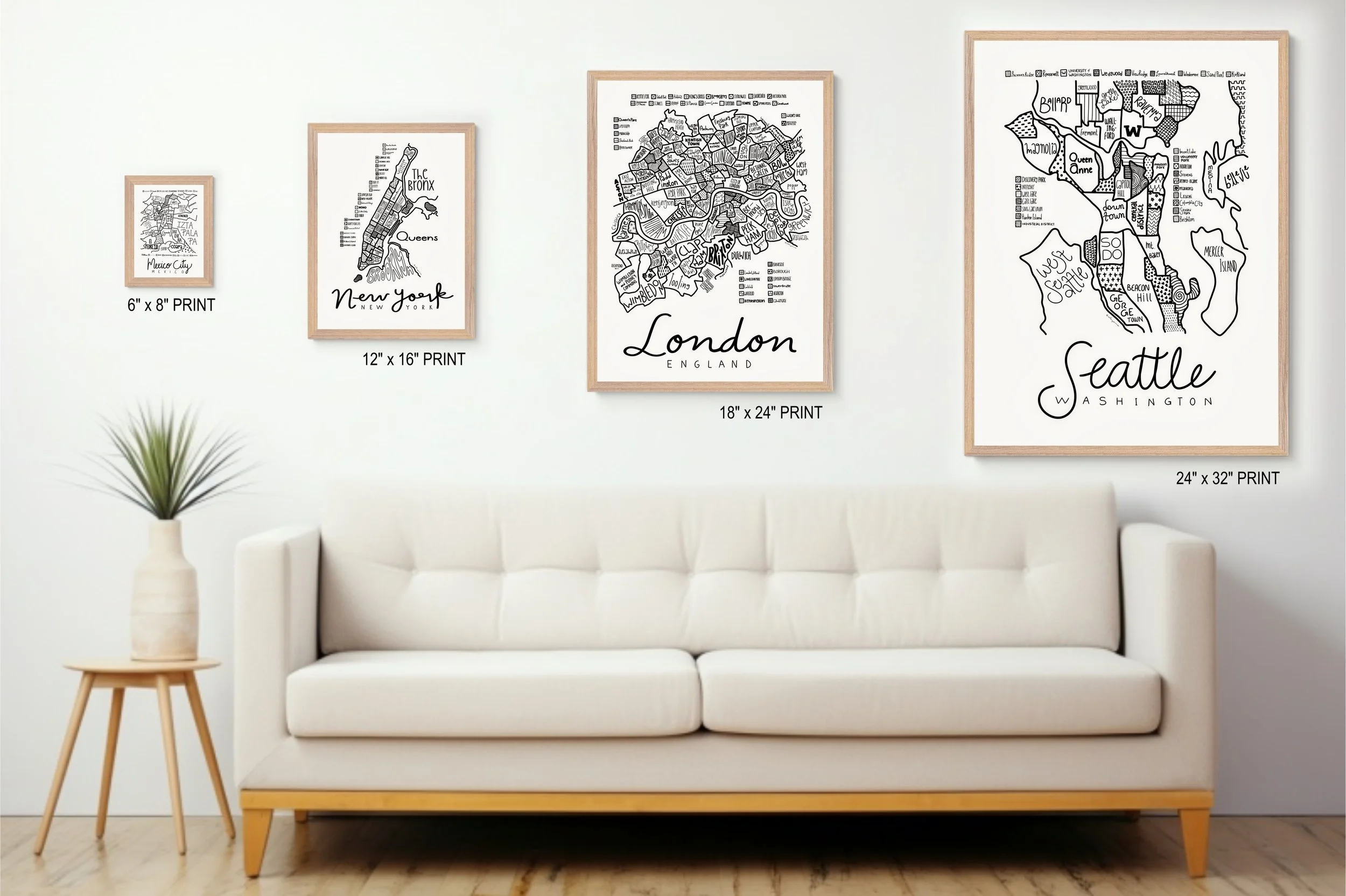 Black and white print of Liam and Michelle’s original neighborhood map design of London, England.